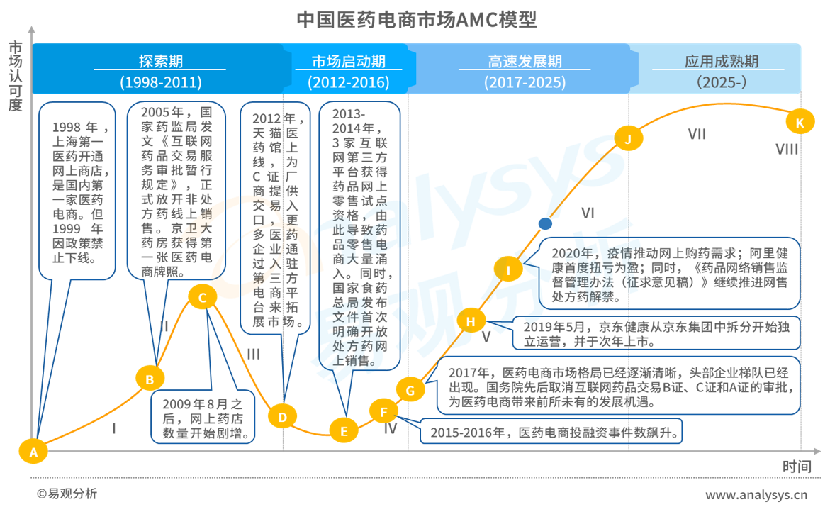 我国医药电商行业自萌芽以来,已历经探索期(1998-2011)、市场启动期(2012-2016),目前正处于高速发展期(2017-2025),预计 2025 年后步入应用成熟期。