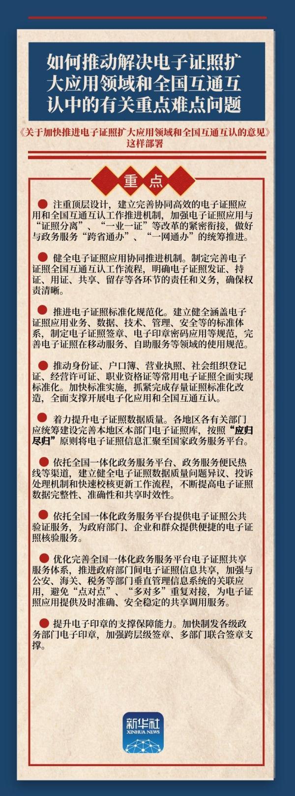 中国电子技术标准化研究院副院长孙文龙说,《意见》不仅列举任务目标,更把基础保障、公共服务措施作为重点任务加以明确;不光提要求,还给出支持路径,这样将扩大电子证照应用和让互通互认更容易落地。