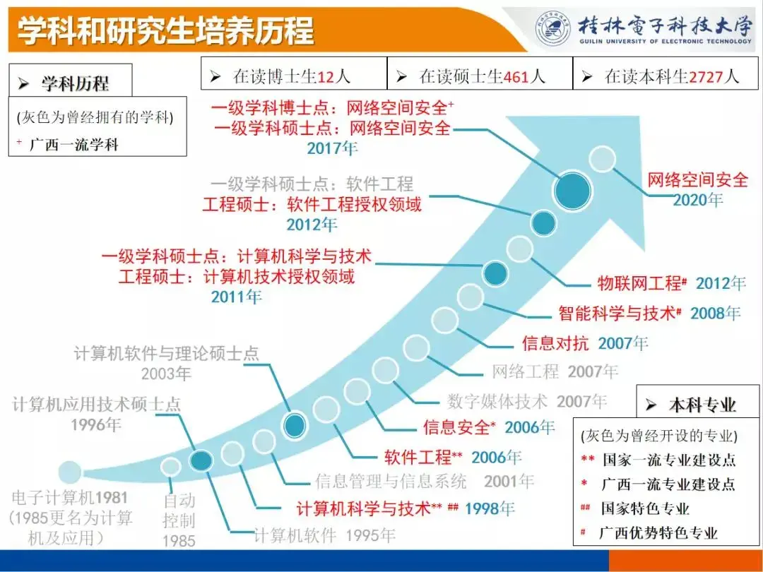 计算机与信息安全学院(是广西最早开办计算机专业教育的单位。 1981年开始招收本科生,1996年开始招收硕士研究生,2006年获得工程硕士培养资格,2017年获批一级学科博士点。