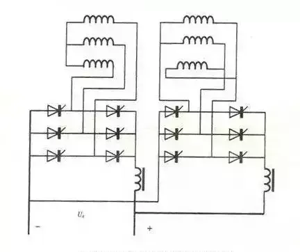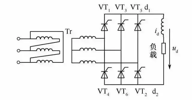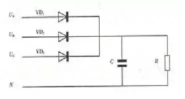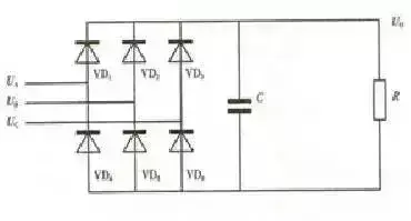 在一个周期中,每个二极管只有三分这一的时候导通(导通角为120度)。负载两端的电压为线电压。