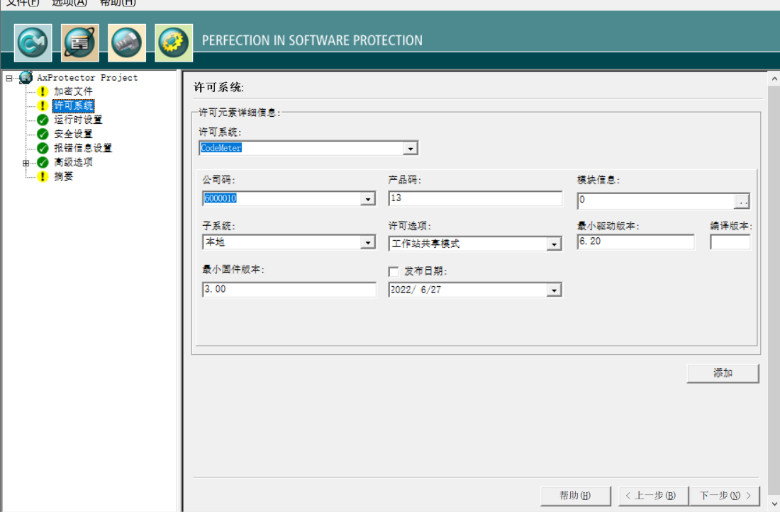 接下来在“许可系统”中,选择需要绑定的授权,授权的相关定义可以参考标准版“CodeMter使用手册”。