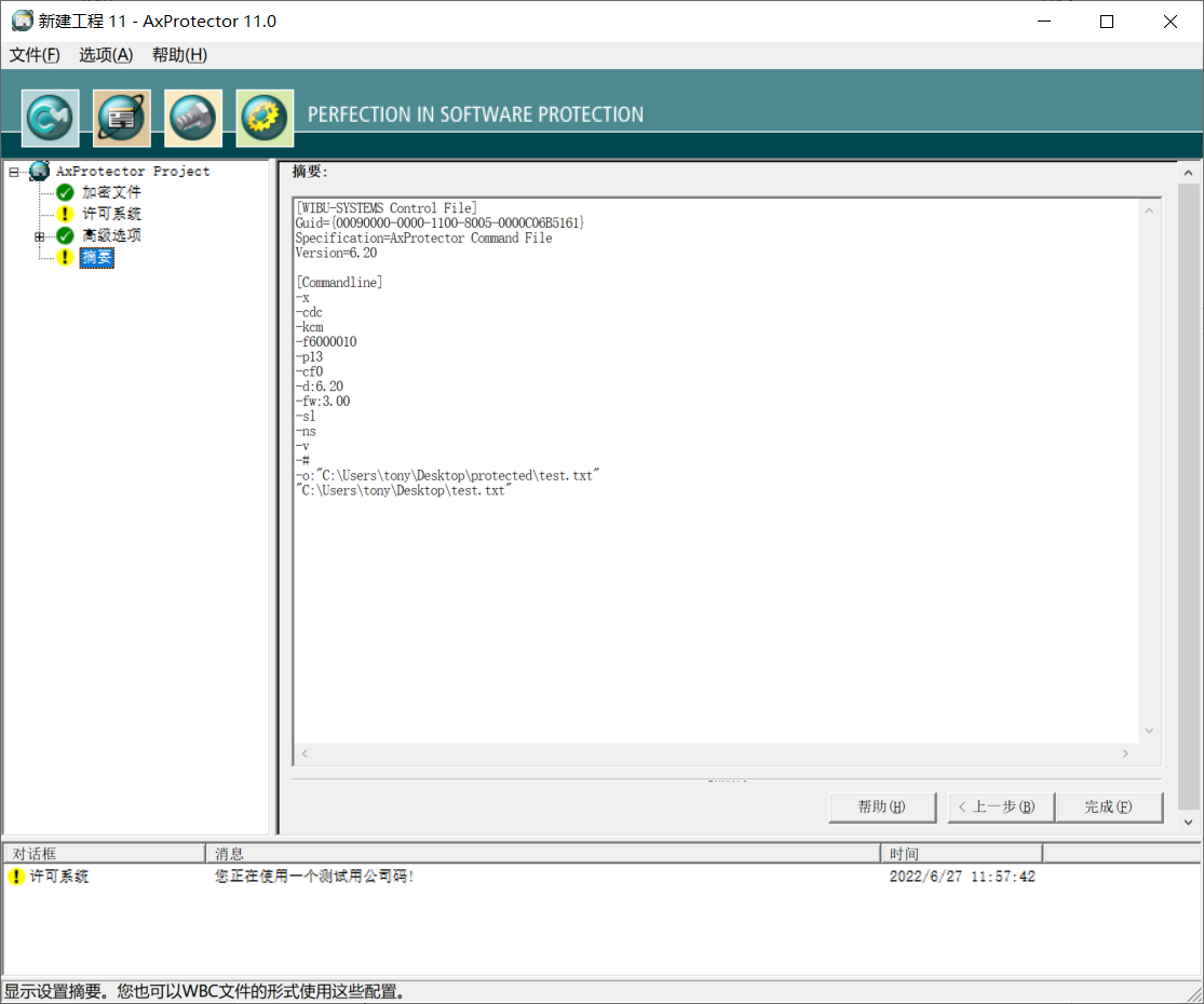 然后按默认步骤执行接下来所有的步骤,直至最后一步点击“完成”,则AxProtector开始加密文件。