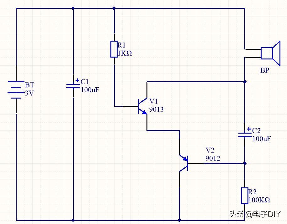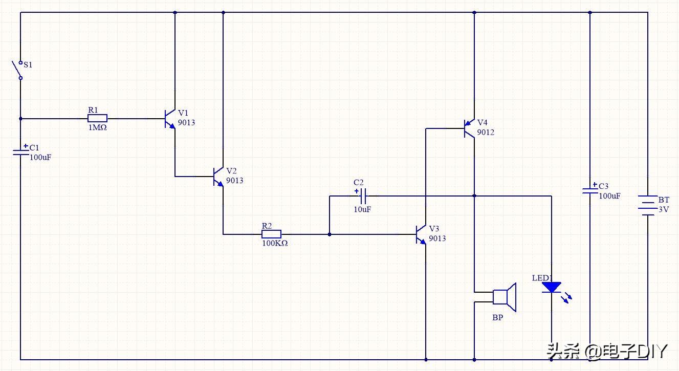 晚上睡觉前,只要按一下开关S1、V1、V2通过R1、S1获得基极偏流迅速导通,V2发射极输出高电平,振荡器立即起振,扬声器BP就发出“哒、哒”的声响,同时LED1还会发出与声音同步的红色闪光。在按下S1的同时,电容C1将通过S1迅速充电,因充电时间常数很小, C1很快充至电源电压。