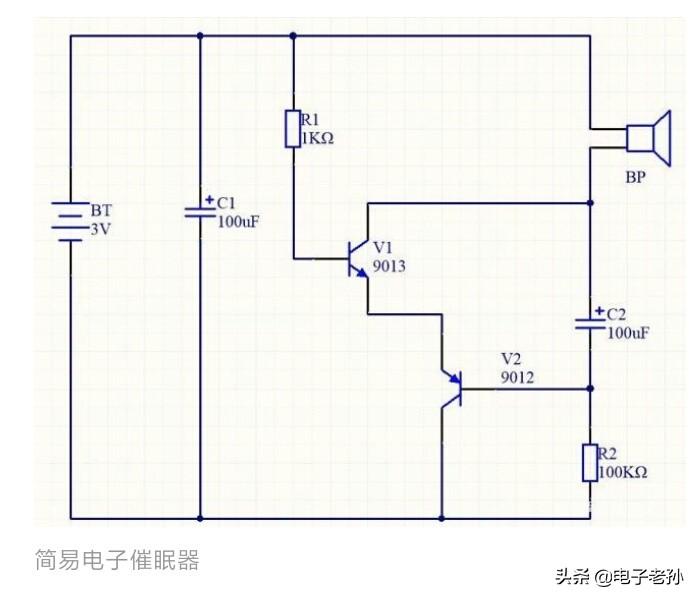 这个电路就是一个简易的电子催眠器,接通电源后,扬声器BP便能发出单调重复的 “哒、哒”模拟雨滴声响,帮助失眠的人尽快进入梦乡。