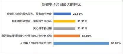 企业对应用人资电子合同的顾虑主要体现在以下几个方面:合法合规性、与现有人资业务系统的对接、成本和价格、用户体验、供应商服务能力等。调研数据显示,超过80%的企业表示,对人资电子合同的合法合规性最为关注。