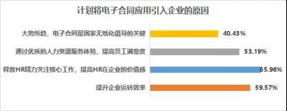 调研数据显示,“释放HR精力关注核心工作”和“提升企业运转效率”,成为企业引入电子合同的两大主要原因。与此同时,“提高员工满意度”和“国家无纸化倡导”也成为企业应用电子合同的关注点。
