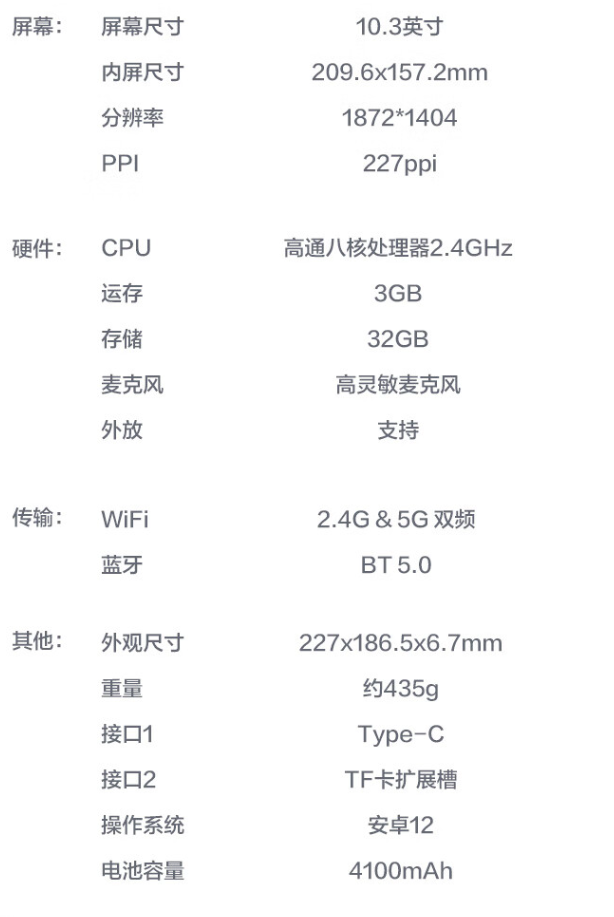 该产品配备高通 8 核 2.4GHz 处理器,支持 3GB 运行内存和 32GB 存储内存、1TB 可拓展存储。其搭载开放安卓 12 系统,支持安装各类安卓软件,拥有自带的墨水屏应用商城。