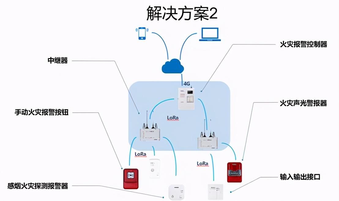 第一套解决方案采用的是传统的星形网络,其优势为部署简单,LoRa自组网,更适合古建筑这类常在人员较少,现场火灾报警为主的场所。