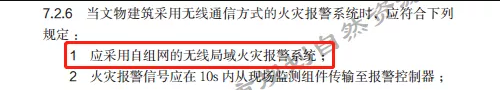 标准7.2.6第一条指出:当文物建筑采用无线通信方式的火灾报警系统时,应采用自组网的无线局域火灾报警系统。