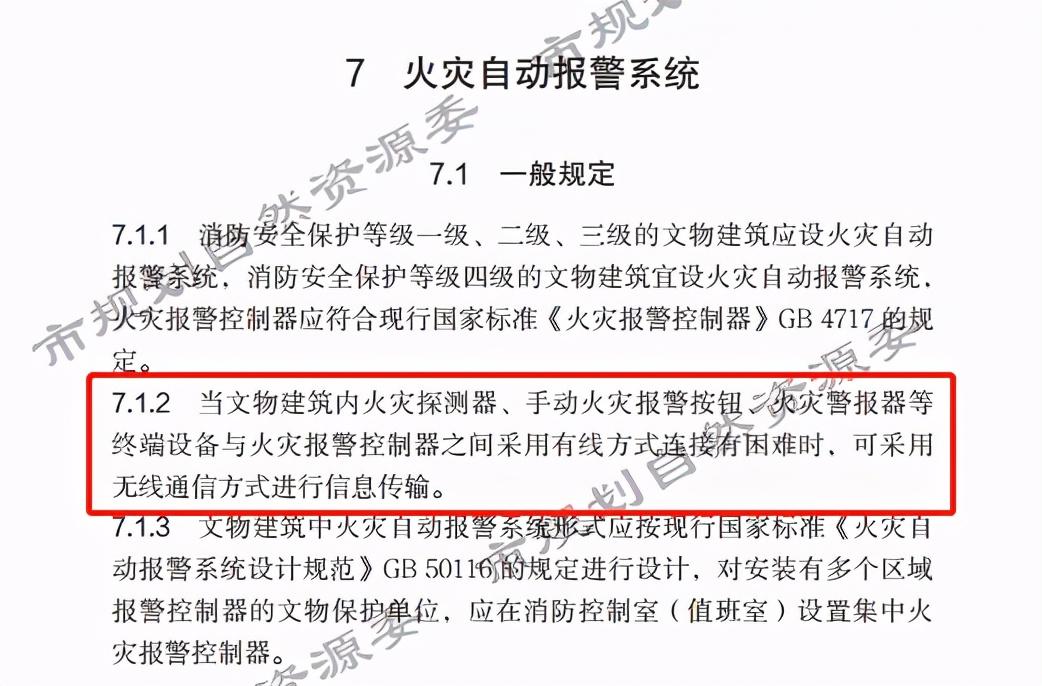 该标准7.1.2条指出:当文物建筑内火灾探测器、手动火灾报警按钮、火灾警报器等终端设备与火灾报警控制器之间采用有线方式连接有困难时,可采用无线通信方式进行信息传输。