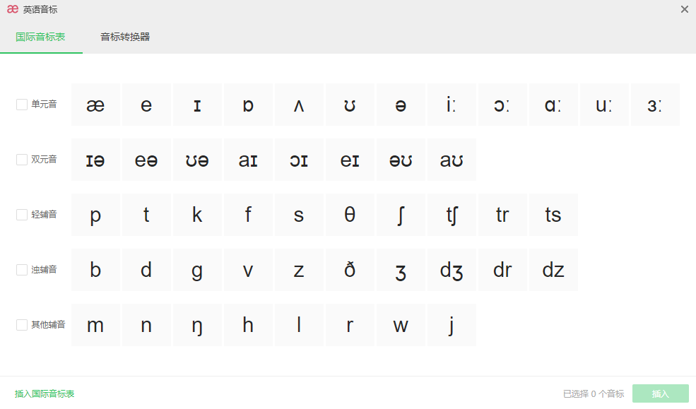 打开完整的IPA音标表,点击对应音标即可发音 。每个音标都可以作为卡片插入到课件中 ,音标卡片包含发音和例词,讲解更具有针对性。
