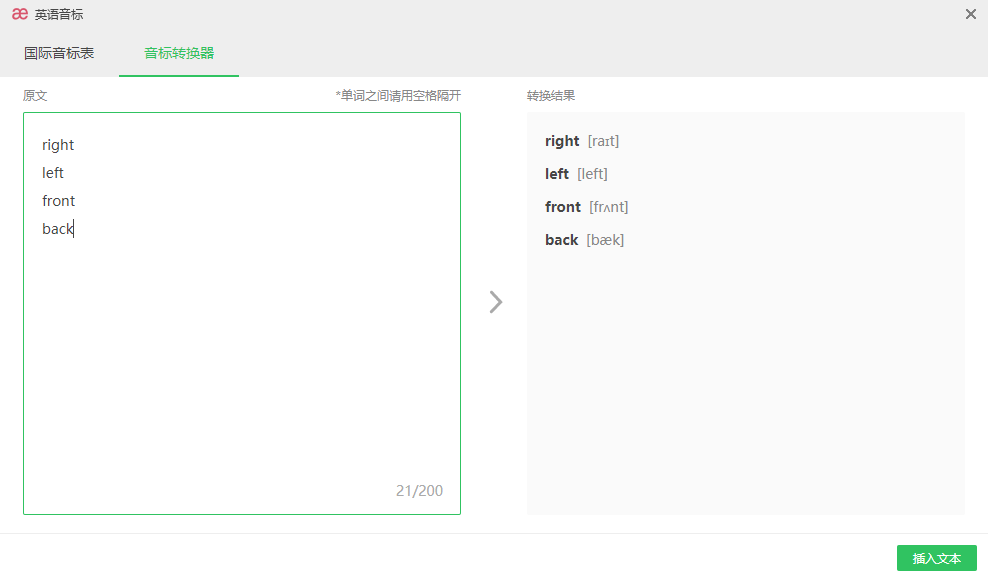 实时音标转换在左侧输入单词,即可实时将单词转换为音标 ,转换完成的音标可作为文本格式插入到课件中 。告别从外部应用复制粘贴音标的烦恼,输入更方便。