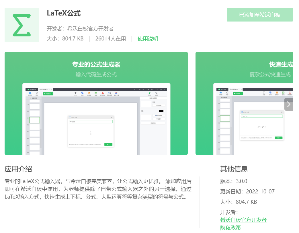 专业的LaTeX公式输入器,与希沃白板完美兼容,让公式输入更优雅。 添加应用后即可在希沃白板中使用,为老师提供除了自带公式输入器之外的另一选择。通过LaTeX输入方式,快速生成上下标、分式、大型运算符等复杂类型的符号与公式。