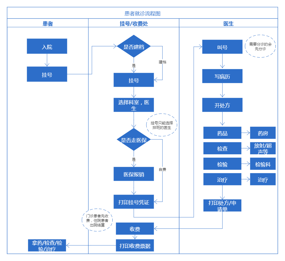 患者到医院后,会到医院的挂号窗口进行挂号,(现在互联网医疗不断发展,患者也可以提前预约挂号),预约挂号的不需要到窗口再进行挂号;挂号处给患者挂号,如果患者没有在本院建档,会在挂号的同时完成建档,下次患者就诊就无需再次建档;挂号时选择科室和医生,医生如果当天没有排班是选择不到的,这就需要和排班系统有接口,挂号时排班系统返回医生数据;挂号收费,如果走医保,患者挂号信息会传给医保接口,患者支付少部分费用,如果是自费,需要患者支付全部挂号费用;挂号完成后,打印挂号凭证,患者带着凭证到对应的科室就诊,有分诊台的医院会将患者分流;分到所在医生的下面后,医生进行叫号;医生通过问诊给患者输写病历,病历信息包括诊断结果、现病史、既往史、诊疗计划等;开处方,包括药品、检查、检验、治疗等;患者带着处方单进行缴费,缴费完成后,收费处会打印收费票据给到患者;患者根据处方去药房拿药,或者到对应的科室做检查。四、门诊电子处方流向介绍