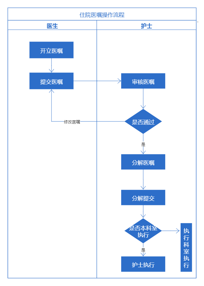 住院医生开立医嘱,提交医嘱;护士审核医嘱,如果医嘱通过,则进行下一步操作,如果驳回医嘱,医生可以修改医嘱重新提交;通过的医嘱,护士执行分解医嘱,分解医嘱一般按照分解时间,执行科室的条进行分解,分解出的医嘱提交后,医嘱就会流向对应的科室;如果是本科室的医嘱,护士操作执行,如果是医技等其他执行科室,需要对应科室执行医嘱。六、长期医嘱和临时医嘱介绍