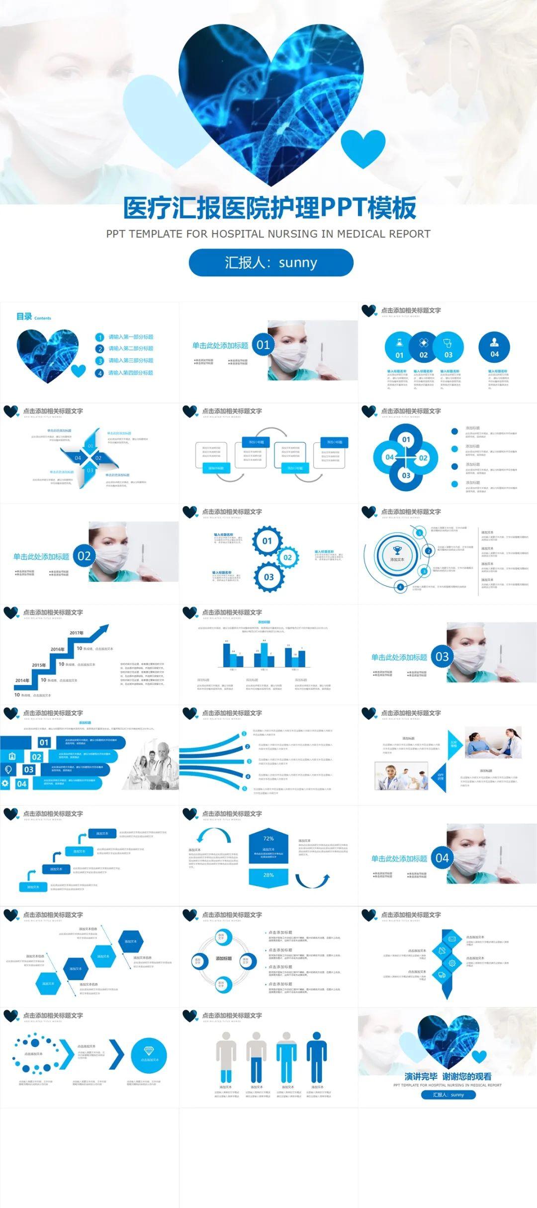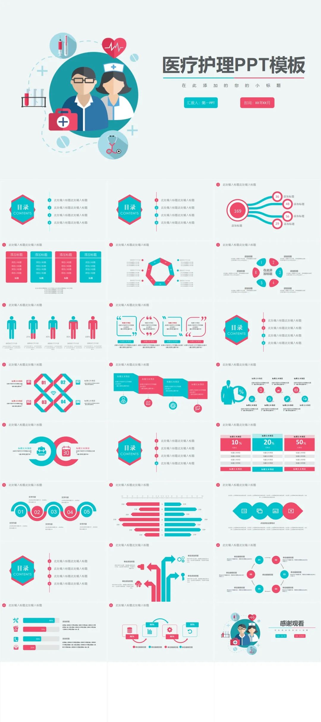 今天分享7套精致医院医疗医生护士护理PPT模板,专门针对护理方面的PPT模板。医疗方法的PPT多以蓝色为主题色,搭配渐变色,或者红色等作为强调。
