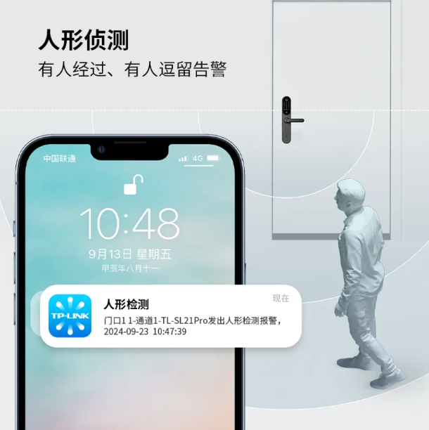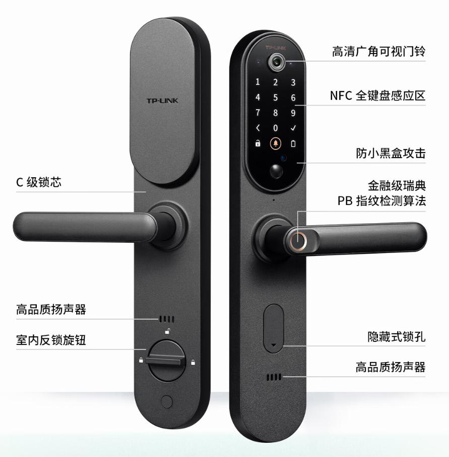 TP-LINK TL-SL21 Pro 还支持人形侦测、AI 人脸识别 ,配有指纹解锁、NFC 解锁、密码解锁、钥匙解锁,搭载 C 级锁芯,支持虚位数字密码、防撬告警、多次试错告警等。
