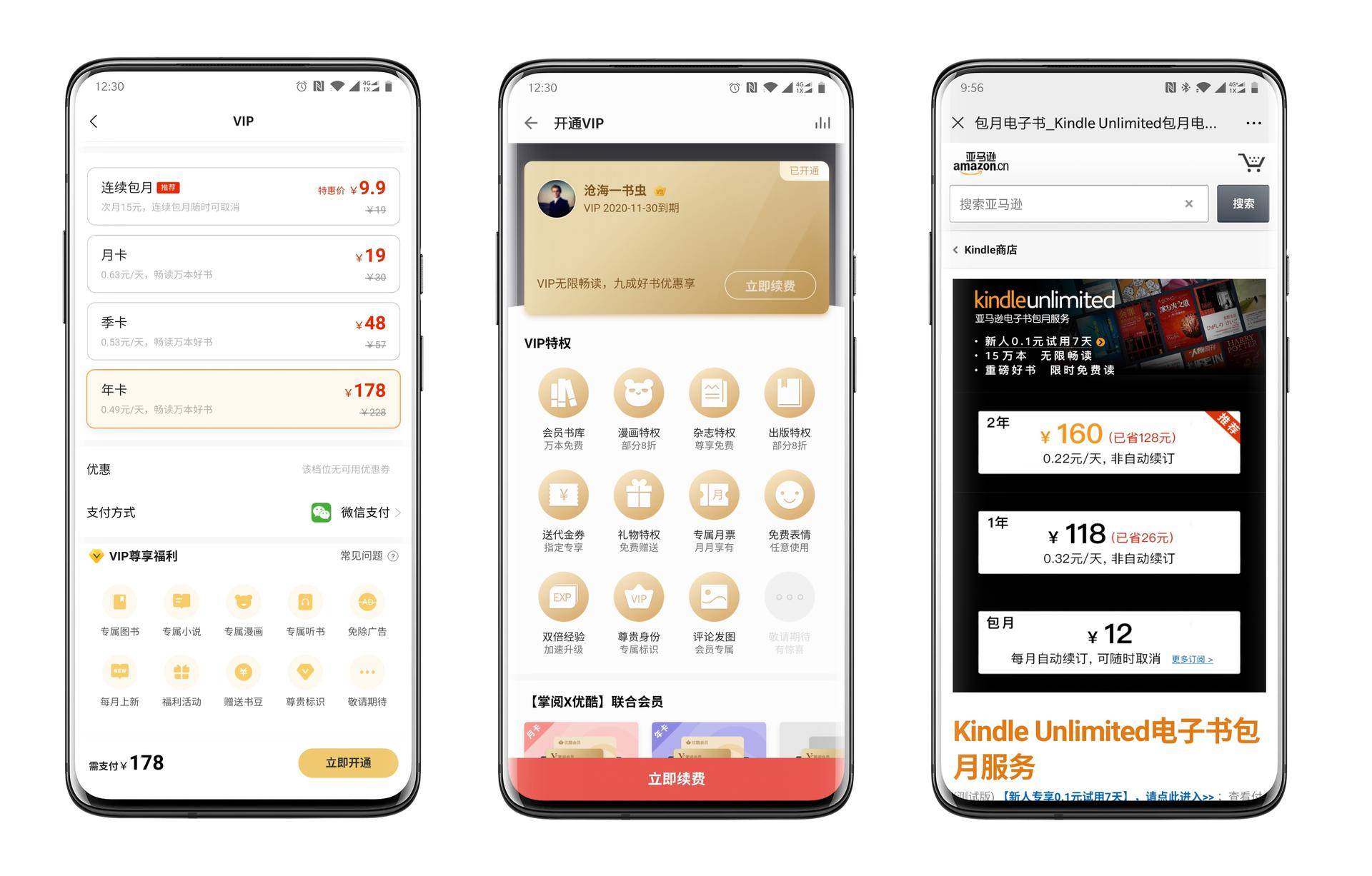 会员三款阅读软件都支持会员订阅,可以提供相关会员服务。而其会员订购价格分别为:178元(多看)、98元(iReader,不稳定,有时要198元,但经常做活动)、118元(Kindle,万能的TB价格要便宜一半)。就价格来说,多看最贵,也是最晚推出。而就会员涵括的内容来看,iReader支持的要更全面一些,除了出版书籍、小说等,还支持《读者》、《意林》等杂志,且书籍以合集为多。而多看和Kindle更多的是一些畅销书籍会员免费阅读,另外,Kindle对会员书籍下载有限制,一次最多能下10本会员书籍,再多则需归还前面所借的电子书,可能Kindle想让我们更专注的阅读完一本书再看下本书,但对已经开通会员的人来说,这样的限制又是令人不爽的。