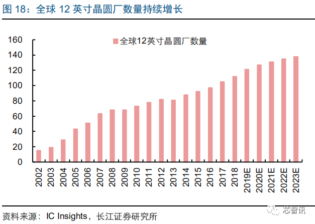 根据 IC Insights 的统计,2018 年全球共有 112 家 12 英寸晶圆厂,至 2023 年这一数字有望增至 138 家。