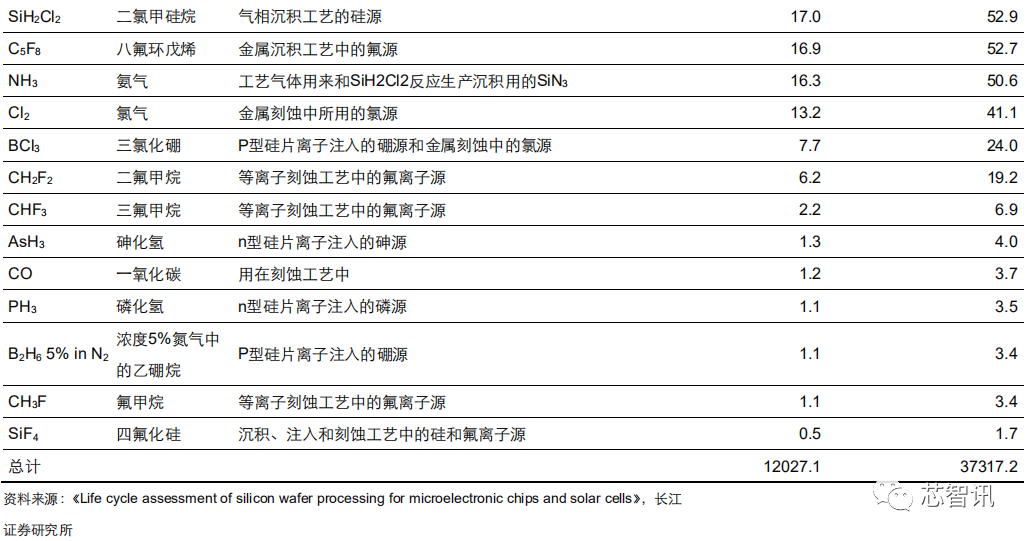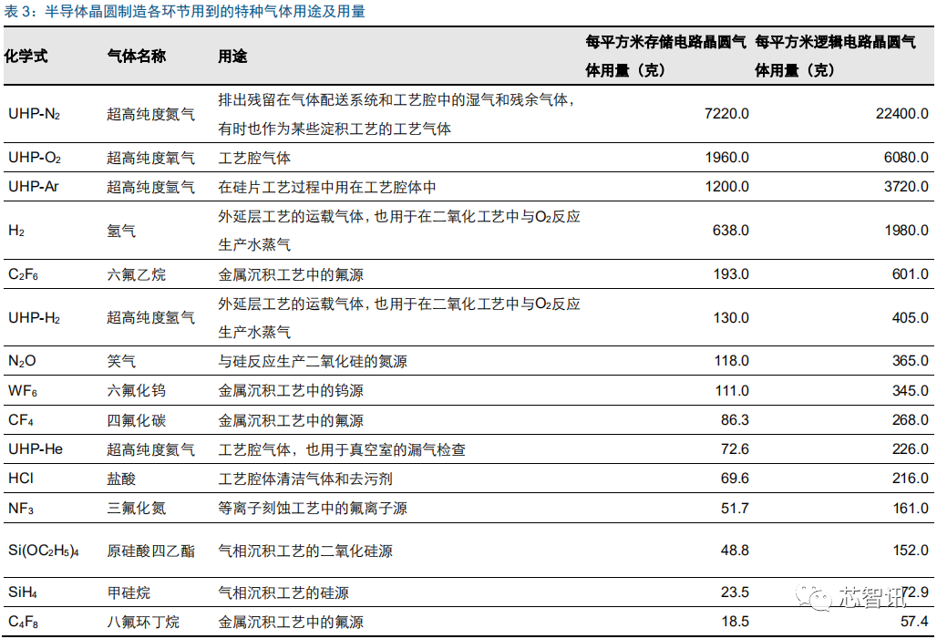随着集成电路制造要求复杂度的提升,制造中所使用的电子特气用量也将提升。根据德国普尔茨海姆应用技术大学工业生态研究所(INEC)的 Mario Schmidt 教授等人共同撰写的论文《用于微电子芯片和太阳能电池硅片加工的生命周期评估》,硅晶圆的加工离不开大量化学试剂以及特殊气体,这些气体可以用于包括清洗、蚀刻、光刻、外延、掺杂等工序。