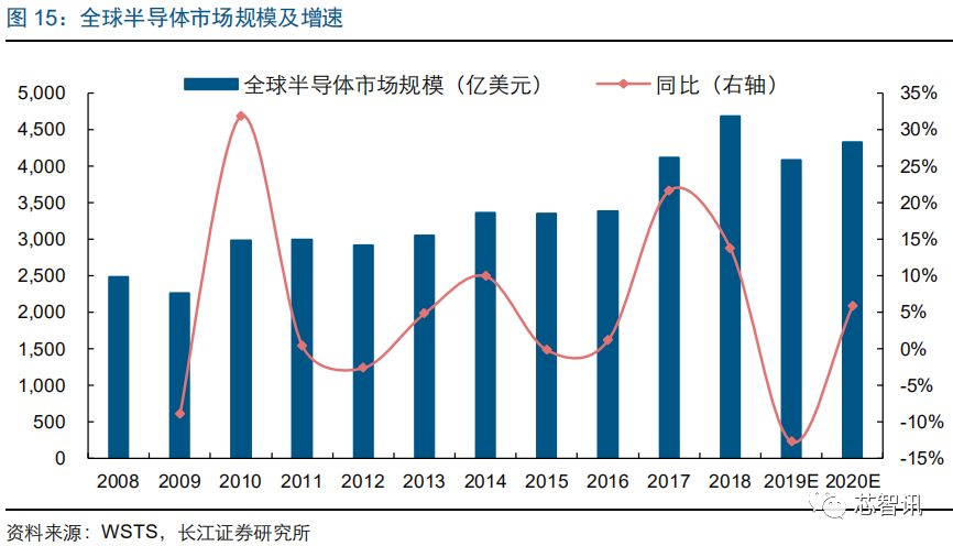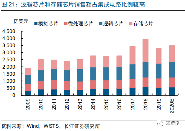 集成电路可分为逻辑芯片、存储芯片、微处理芯片和模拟芯片。2019 年逻辑芯片和存储芯片销售额分别为 1046.2 亿美元和 1059.1 亿美元,占集成电路比例分别为 31.7%和 32.1%,为集成电路的主要增长动力。由于价格大幅波动等原因,2019 年逻辑芯片和存储芯片的销售额出现较大幅度下滑,但 WSTS 预测 2020 年有望继续恢复增长。