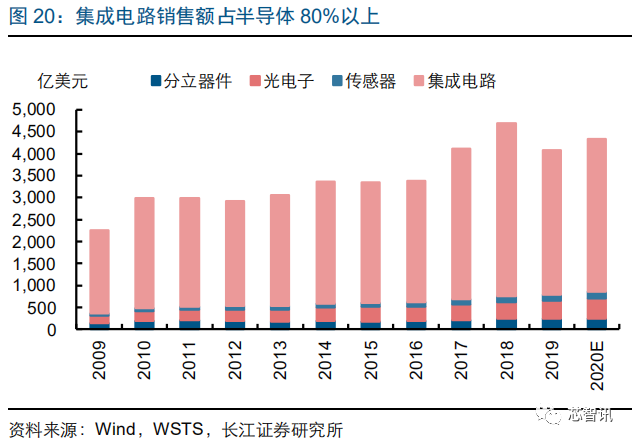 逻辑芯片和存储芯片为集成电路主要增长动力。根据 WSTS 的数据,集成电路是半导体产业中最主要的市场,规模占比维持在 80%以上。