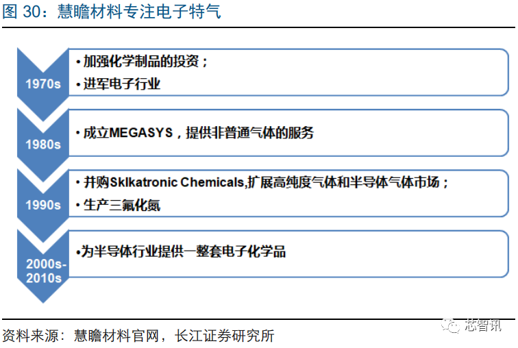 慧瞻模式:专注电子特气,内生+收购,从单一品类向多品类拓展。慧瞻材料成立于 2015年,前身为空气化工产品公司的电子材料部,后单独上市,空气化工产品公司的股东即为慧瞻材料的原始股东。公司于 20 世纪 70 年代进军电子行业,立足于三氟化氮等产品,逐步向整套电子化学品拓展。慧瞻材料的核心竞争力在于产品多样性、服务即时性以及客户的优质性。