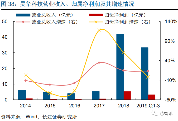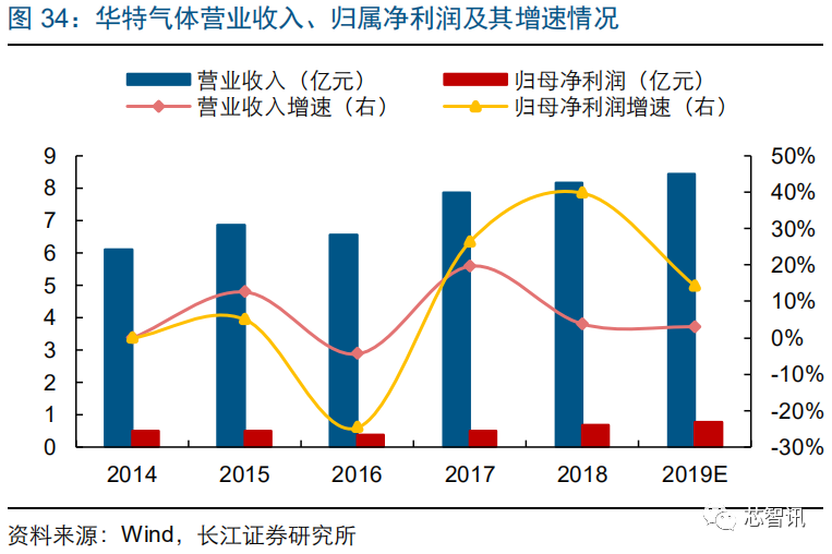 公司下游客户包括中芯国际、长江存储、台积电等知名晶圆厂商。公司发布 2019 业绩快报,2019 年实现营业收入 8.4亿元,同比增长 3.1%;实现归母净利润 0.8 亿元,同比增长 14.4%。2019 年上半年,公司特种气体业务实现营收 2.1 亿元,占比 53.4%;实现毛利 0.8 亿元,占比 60.1%,毛利率达到 40.7%。
