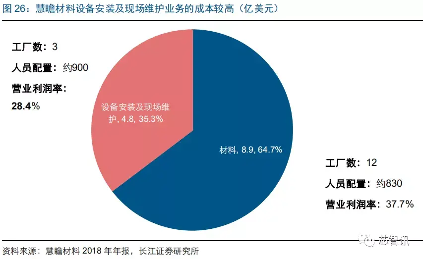 维护成本方面,我们以具有近 50 年运营经验的慧瞻材料的业务模式为例进行分析。2018年慧瞻材料的营收中,材料占比约 65%,剩下 35%为设备安装及现场维护。但从人员配置上看,材料业务在全球有 12 个工厂,分布在美国、韩国和中国台湾(美国 7 家,韩国 4 家,中国台湾 1 家),相应工作人员在 830 名左右;而设备安装及现场维护业务的人员配置达 900 人,其中现场服务环节人员 400 人,营业利润率低于材料业务。显然,中国大陆企业相应的运输服务及现场维护将更为快速,且成本更低。