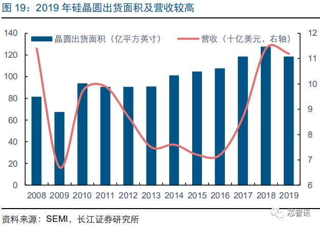 根据 SEMI 数据,2019 年硅晶圆的出货面积为 118.1 亿平方英寸,营收达112亿美元,均为较高水平。2013-2018年半导体市场规模的平均增长率达8.9%,2020 年半导体下游需求可能会受疫情影响,但从中长期看,随着 5G 技术、新能源汽车、云服务器等市场的增长,有望带动行业进入新的增长期。作为半导体制造环节中占比第二高的材料,电子特气的需求也有望不断提升。