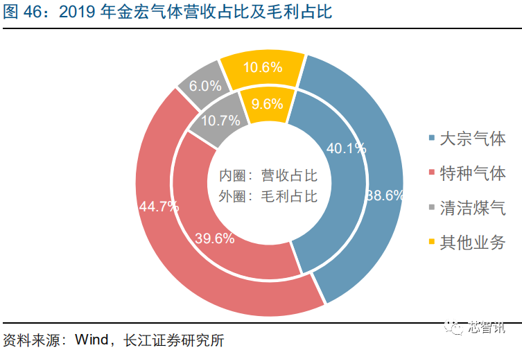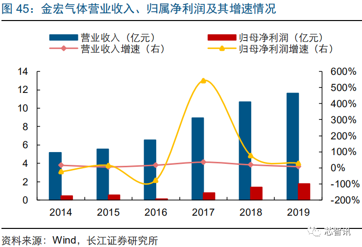 金宏气体是长三角地区的气体厂商,公司目前已初步建立品类完备、布局合理、配送可靠的气体供应和服务网络,能够为客户提供特种气体、大宗气体和天然气三大类100多个气体品种。公司的特种气体品种包括:超纯氨、氢气、氧化亚氮、氦气、混合气、医用气体、氟碳气体等。公司下游客户包括集成电路行业的晶方半导体、上海新傲、厦门联芯;液晶面板行业的京东方、天马微电子、TCL华晶、中电熊猫;LED行业的三安光电、聚灿光电、乾照光电;光纤通信行业的亨通光电、富通集团;光伏行业的通威太阳能、天合光能、隆基股份等。公司2019年实现营业收入11.6亿元,同比增长8.5%,实现归属净利润1.8亿元,同比增长27.4%。2019年,公司特种气体业务实现营业收入4.6亿元,占比39.6%,实现毛利2.5亿元,占比44.7%,毛利率达到54.8%。