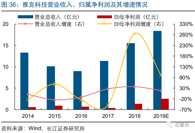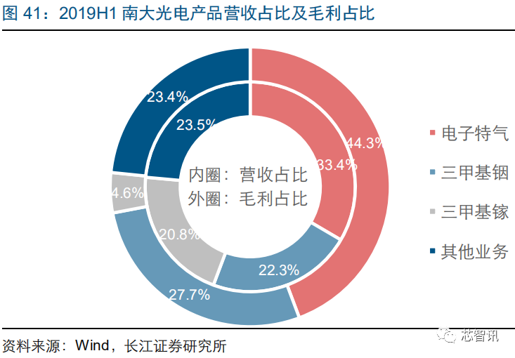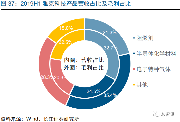 先进 MO 源生产企业,积极布局电子化学市场。公司是一家专业从事先进电子材料——高纯金属有机化合物(MO 源)的研发、生产和销售的高新技术企业,对关键技术拥有完全自主知识产权,亦是全球 MO 源领导供应商之一。公司在 MO 源的合成制备、纯化技术、分析检测、封装容器等方面已全面达到国际先进水平,可以实现 MO 源产品的全系列配套供应。公司正积极拓展新的领域,已经开发出多款应用于 IC 行业的先进电子化学品并通过了客户验证。公司发布 2019 年业绩快报,2019 年实现营业收入 3.2 亿元,同比增长 38.6%,实现归属净利润 0.5 亿元,同比增长 4.0%,业绩小幅提升。2019 上半年,公司电子特气业务实现营业收入 0.5 亿元,占比 33.4%,实现毛利 0.3 亿元,占比 44.3%,毛利率达到 60.8%。