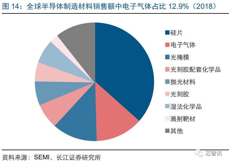 根据 SEMI 的数据,2018 年电子气体在晶圆制造材料市场中占比达到12.9%,仅次于占比 36.6%的硅片,市场规模巨大。