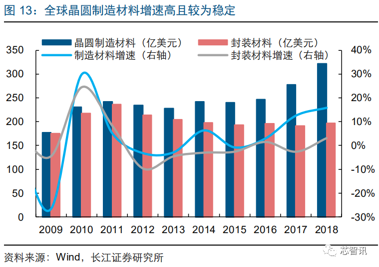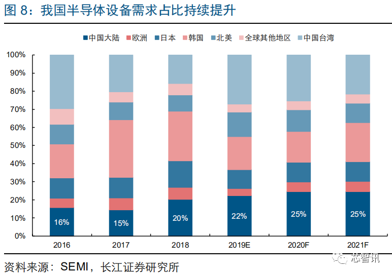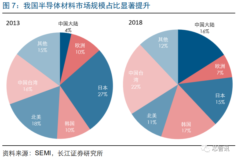 从近几年大陆半导体材料、设备的需求占比来看,大陆半导体材料市场规模占全球的比重由 2013 年的约 4%提升到 2018 年的约 16%,大陆半导体设备市场规模占全球比重由 2016 年的约 16%提升到 2018 年的约 20%。而可预见的未来,国内半导体产能的增加将进一步带动本地半导体材料需求。