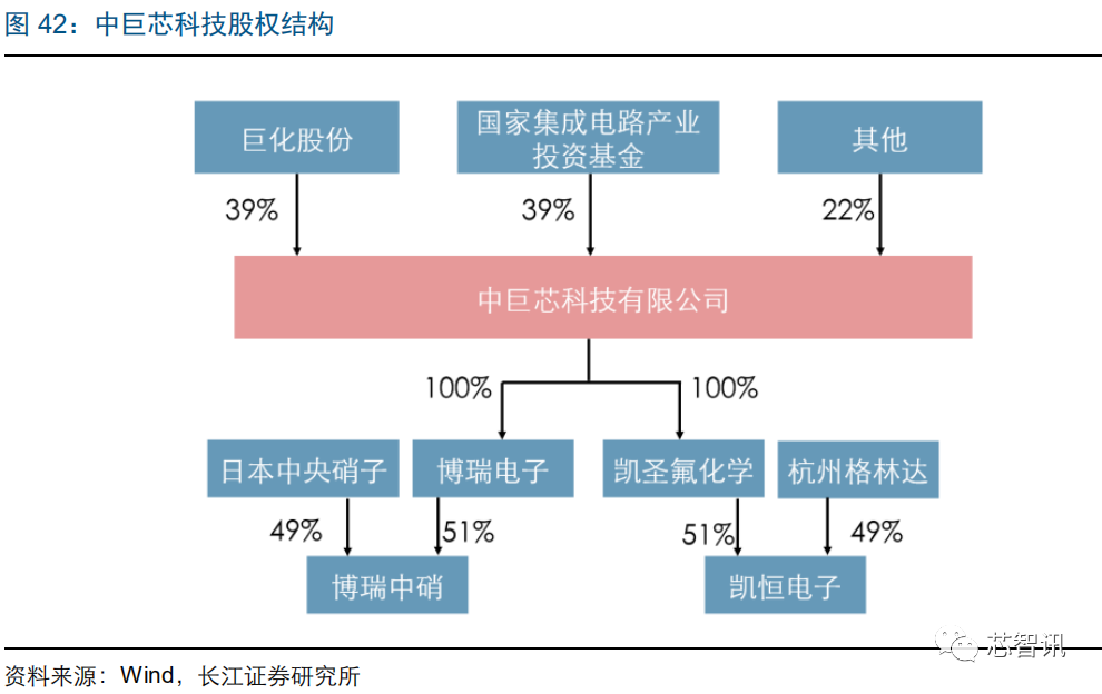 氟化工龙头,联手大基金布局电子特气业务。公司拥有国内领先的氟化工、氯碱化工综合配套的氟化工制造业基地。2018 年 4 月,为避免同业竞争,公司将博瑞电子及其子公司博瑞中硝、凯圣氟化学及其子公司凯恒电子 100%股权转至中巨芯科技有限公司。中巨芯是由公司、国家大基金和其他公司共同出资成立的联营企业。公司与国家大基金分别出资 3.9 亿,对中巨芯的持股比例均为 39%。
