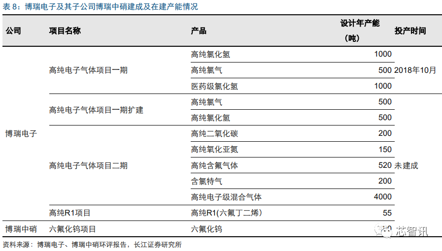 博瑞电子及其子公司博瑞中硝专注电子特气业务。博瑞电子的业务涵盖电子气体板块,产品主要包括电子级氯气、氯化氢,电子级氟化氢等含氟系列气体,主要用于集成电路、平板显示等制造过程中的干式和湿式清洗、蚀刻、成膜及掺杂等工艺。
