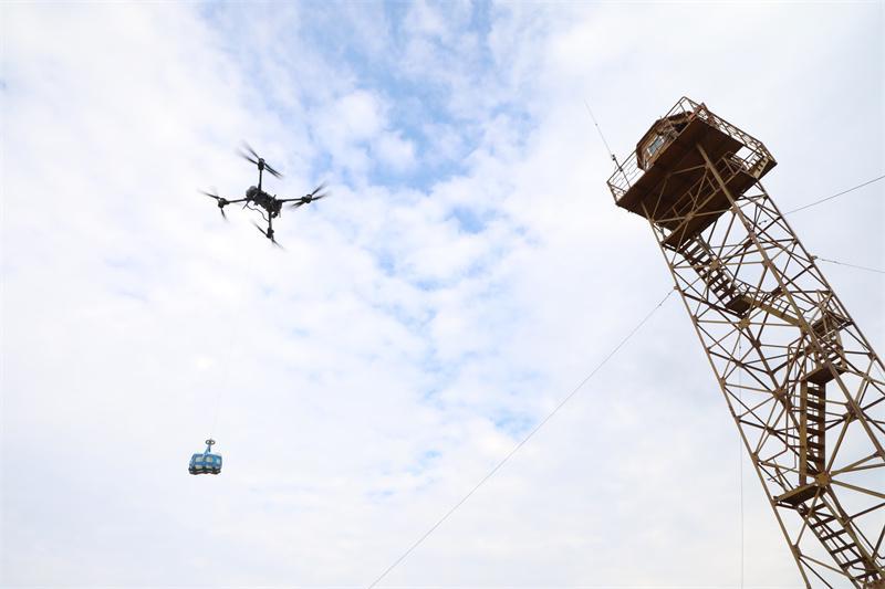 相较于人工输送给养至少需要一个半小时,载重无人机仅需五分钟即可将物资送达火场。该型无人机在不悬挂物品的情况下,往返飞行距离可达十公里;即便悬挂50公斤重物,其往返飞行距离也能达到五公里。此外,该无人机还配有降落伞,如遇突发情况,可以自动开伞,确保无人机安全。