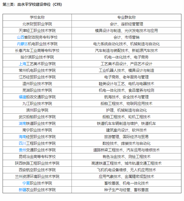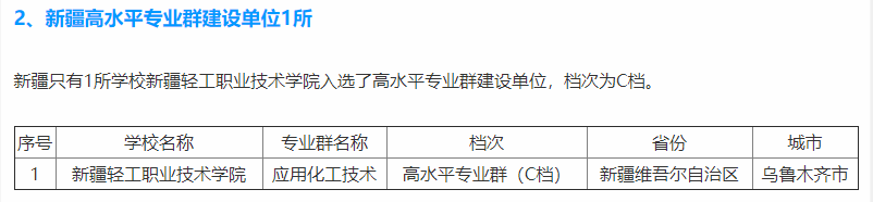 新疆轻工职业技术学院入选高水平专业群建设单位名单,此名单全国共计141所学校,也分为A、B、C三档,代表着中国发展还不错的高职学校。新疆轻工职业技术学院属于第四类,也即C档。