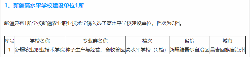 新疆农业职业技术学院入选高水平学校建设名单,属于第三类,也就是C档。