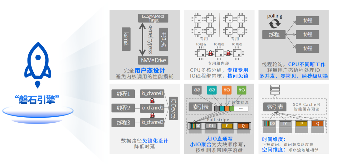 新架构支持全用户态设计,节省大量的处理器时间开销;CPU 资源无锁化,大大提升处理器的利用效率;独立协程模型,保障处理器不间断工作,任务切换时间降低至纳秒级;介质资源无锁化,去除锁机制干扰,避免资源争抢;大 IO 直通小 IO 聚合,大大提升随机小 IO 的性能;智能缓存预读,大大提升存储读性能。
