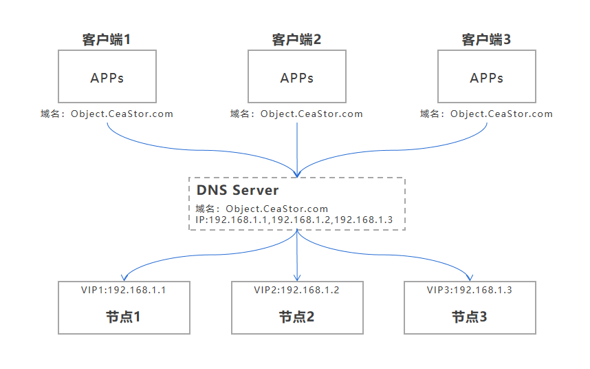 不同业务客户端的应用,配置相同的域名,域名经过 DNS 解析后,会被解析为不同的 VIP,然后通过轮询或节点负载等策略将数据打散到对应 VIP 的存储节点上,从而实现业务的负载均衡。当出现某节点故障,该节点的 VIP 会漂移到其他健康节点上,该节点上的业务会快速切换到对应节点进行支撑。