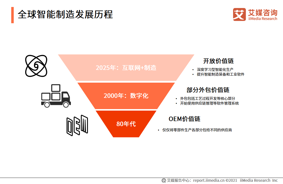 全球智能制造行业发展历经三个阶段。从1980年代开始,仅将零部件生产包给不同供应商的OEM价值链,发展至2020年,外包包括生产链核心部分,开始使用软件管理系统的数字化制造时代。未来,智能制造领域将往开放价值链的方向发展。随着5G、大数据和深度学习等技术领域的发展和应用,服务商将不仅提供某些关键生产环节的服务,还将往设计、原型制造、零部件生产和系统集成等领域发展,智能制造装备和工业软件技术水平也将显著增强。