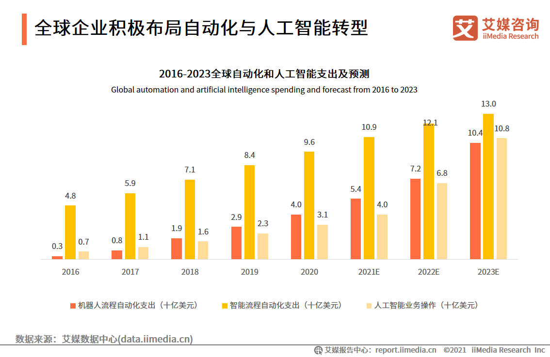 随着全球自动化、人工智能等技术的发展,各国企业在自动化和人工智能领域的支出也随之增加。全国企业的机器人流程自动化支出从2016年的3亿美元上涨至2020年的40亿美元,预计将在2023年上升至104亿美元;全国企业的智能流程自动化支出从2016年的48亿美元上涨至2020年的96亿美元,预计将在2023年上升至130亿美元;全国企业的人工智能业务操作方面的支出从2016年的7亿美元上涨至2020年31亿美元,预计将在2023年上升至108亿美元。艾媒咨询分析师认为,自动化、人工智能和传统产业,尤其是制造业的结合将是未来企业提升用工效率和竞争力的重要要素。