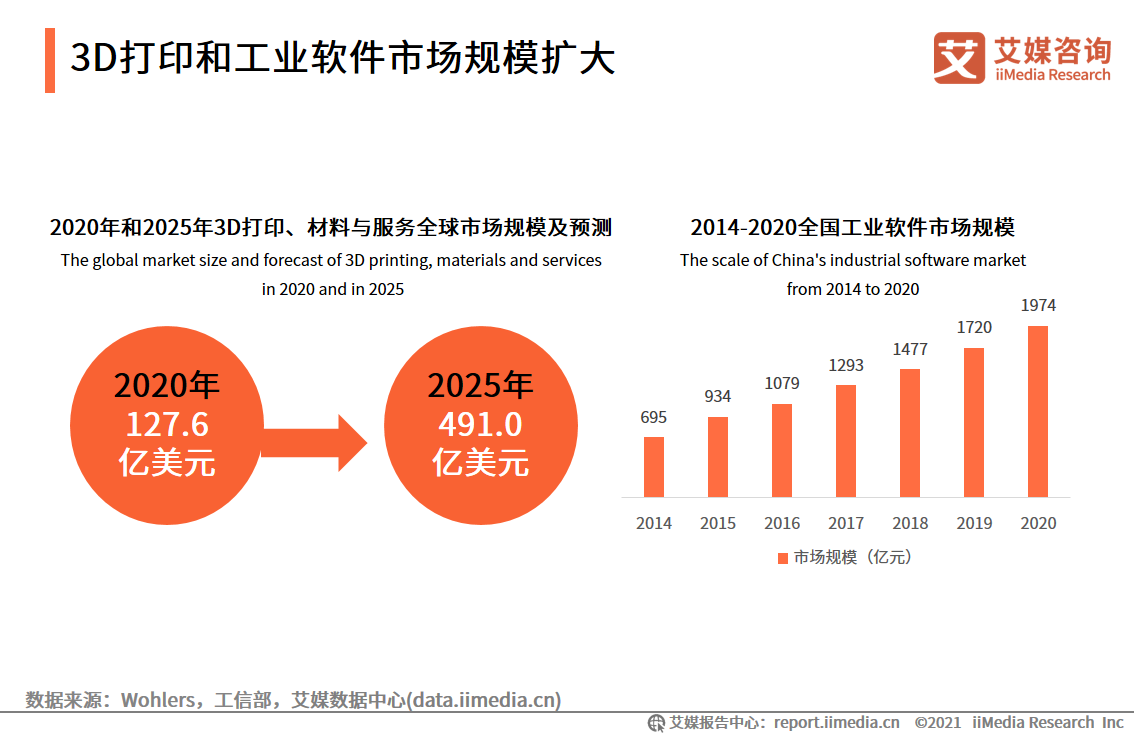 iiMedia Research(艾媒咨询)数据显示,2020年全球3D打印、材料与服务全球市场规模达到了127.6亿美元,预计将在2025年暴增至491.0亿美元;而全国工业软件市场规模增长势头强劲,从2014年的695亿元上升至2020年的1974亿元。3D打印可以在智能制造的定制化生产、供应链管理、产品设计、提高上市速度等方面发挥作用,目前已经在智能医疗、智能新零售、智能设计等领域应用;工业互联网主要是由工业平台为企业提供定制化的服务,帮助企业上云,是实现智能制造的发展模式和现实的路径。随着3D打印和工业互联网的规模进一步扩大,中国制造业智能化也将蓬勃发展。