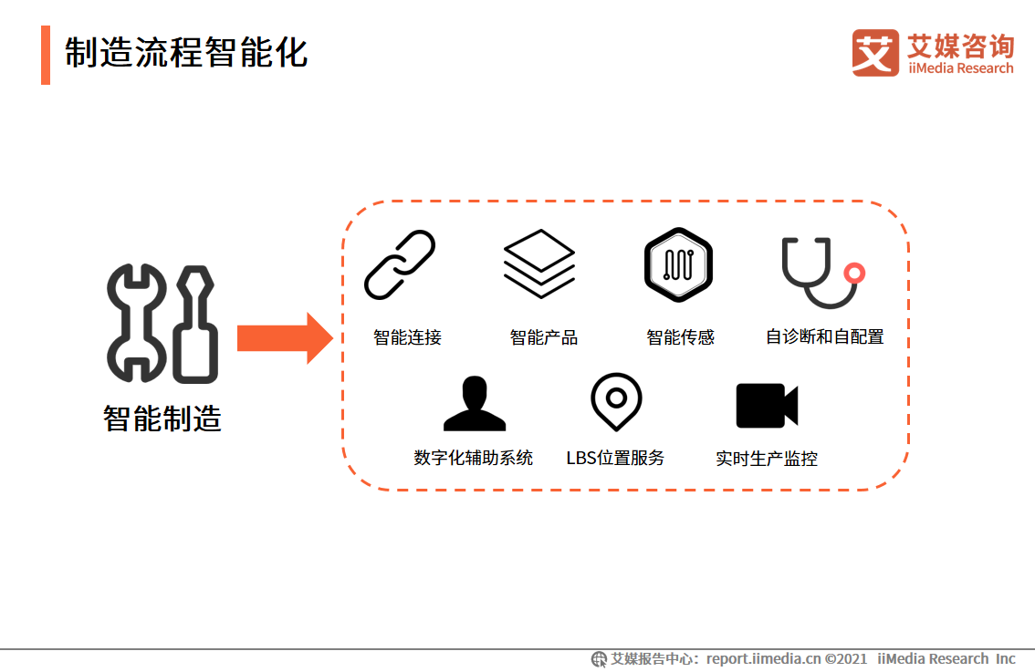 智能制造行业在生产的各个方面全方位地推动制造业智慧化转型,包括连接消费者和制造商、连接产品和设备等的智能连接服务,RFID等智能产品、提供质量监测和机台数据监测等的智能传感、提供设备自诊断和自配置服务、以人为中心,包含虚拟现实、增强现实等的数字化辅助系统、流程工件等精准定位的LBS位置服务,包含生产KPI实时监控、实时报警等的实时生产监控服务等。