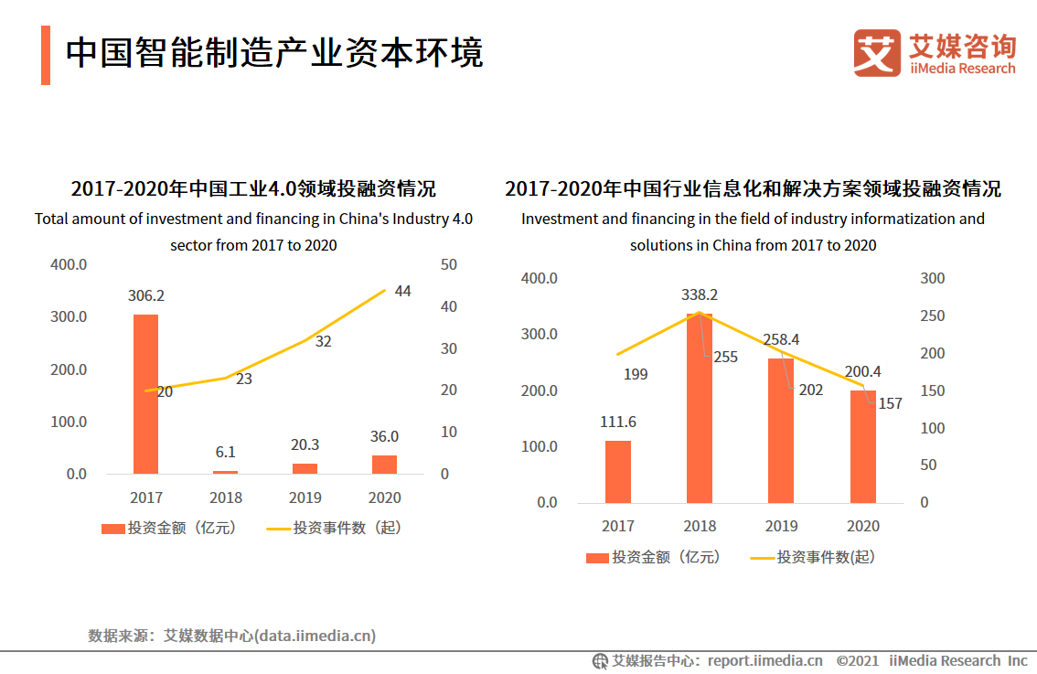 iiMedia Research(艾媒咨询)数据显示,中国工业4.0的投资金额和投资事件数从2018年的6.1亿元和23起回暖至2020年的36.0亿元和44起;而中国行业信息化和解决方案领域投融金额和数量从2018年338.2亿元和255起逐步减至200.4亿元和157起。资本在工业4.0领域的投资逐渐回归理性,已经建成护城河的企业将更受资本青睐;而中国行业信息化和解决方案领域已具一定成熟度,融资目的将更加集中于增加企业核心优势。