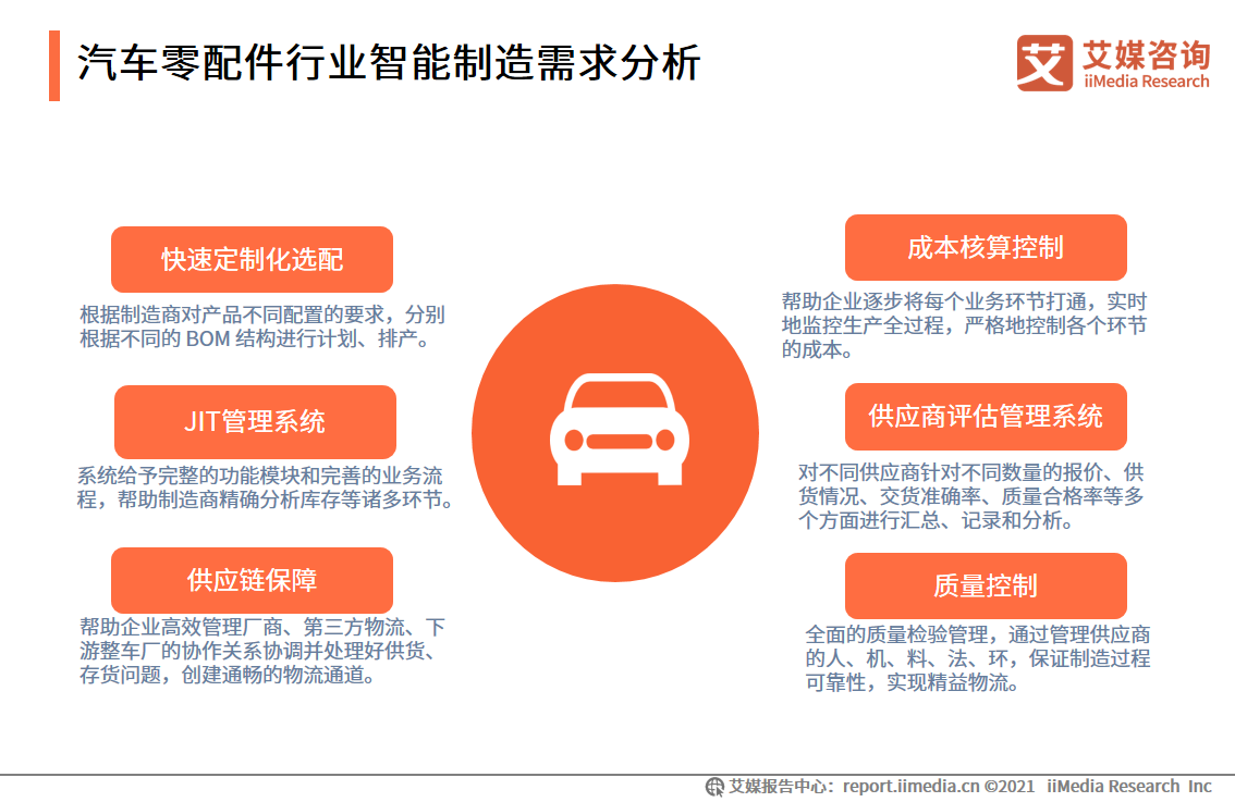 汽车零配件行业对智能制造的需求主要体现在快速定制化选配生产、JIT管理系统、供应链保障、成本核算控制、供应商评估系统和质量控制等六个方面。智能制造将企业所有经营数据在同一个数据库集中处理,实现降本提效的同时,能够及时做出反应和决策。同时,智能制造全面提升企业供应链运营效率,提高企业对客户的快速响应能力,并最终以提高汽配企业生产经营经济效益,增加企业核心竞争能力和抗风险能力为目标。