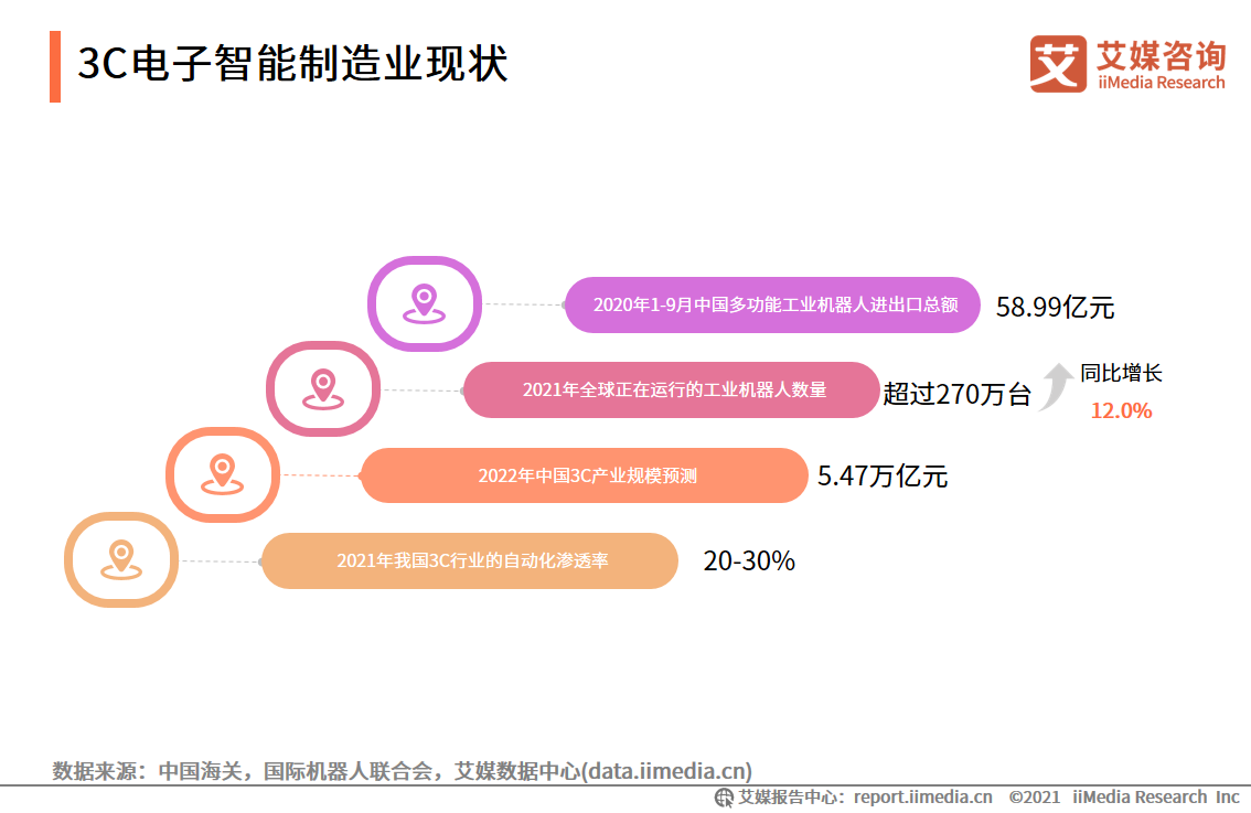 近年来,全球3C电子制造业不断进行信息化、数字化和智能化的改革升级,2020年1-9月中国多功能工业机器人进出口总额达到58.99亿元,全球正在运行的工业机器人数量也超过了270万台,同比增长12.0%。在技术改革的帮助下,预计2022年占全球产能70%的我国3C电子智能制造业规模将达到5.47万亿元。虽然技术改革已初见成效,但是我国3C电子智能制造业自动化渗透率还不高,仅有覆盖了20-30%的生产流程。未来行业将进一步进行数字化、智能化的改革,减少人力成本,进一步释放产能。