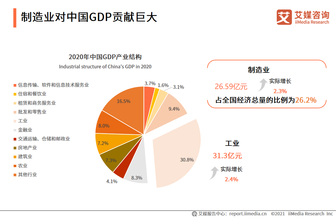 制造业对中国GDP贡献巨大。2020年,中国创造的GDP总量突破100万亿元,实际增长2.3%。工业行业完成的GDP为31.3亿元,占全国经济总量的30.8%,实现了2.4%的增长。其中,制造业完成的GDP为26.59亿元,实际增长2.3%,占全国经济总量的比例为26.2%。在双循环制度提出和供给侧结构性改革的大背景下,制造业对全国经济的重要性将进一步提高。