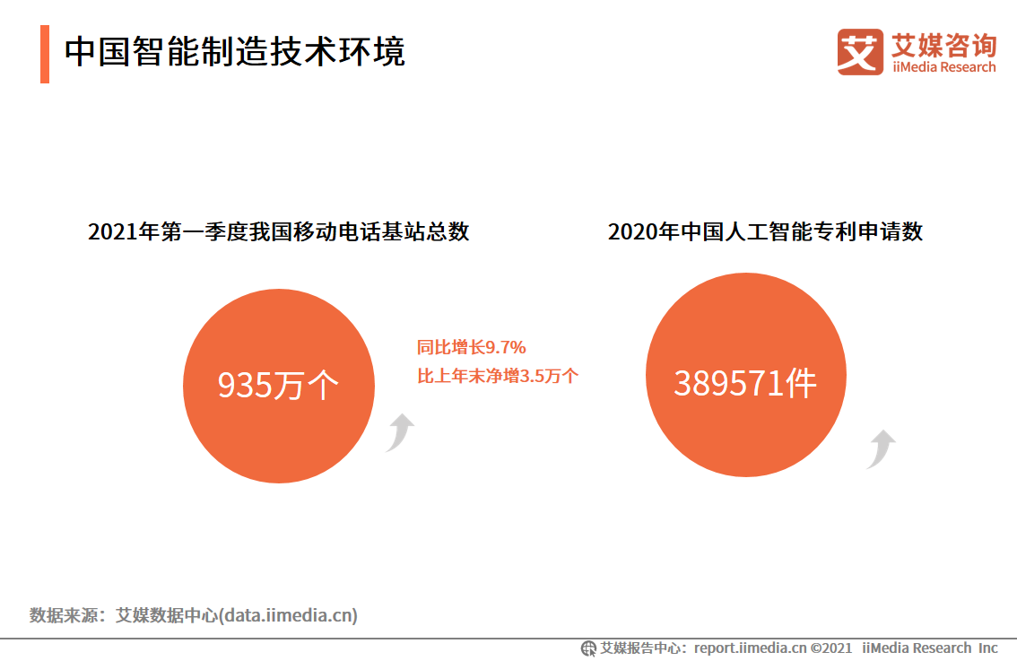 iiMedia Research(艾媒咨询)数据显示,截至3月末,我国移动电话基站总数达935万个,同比增长9.7%,比上年末净增3.5万个。其中,5G基站总数81.9万个,其中1-3月新建4.8万个。2021年第一季度移动电话基站数量将增加至935万个,为信息传输奠定基础;人工智能研发依然保持火热,专利申请量达到389571件,位居世界第一,占全球总量74.7%。艾媒咨询分析师认为,5G、人工智能、工业互联网和大数据等技术的逐步成熟,为中国智能制造产业发展打造了良好的技术环境。